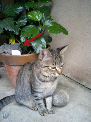 うちのにゃんこをハイビスカスとともにカシャっと撮ってみると、そのハイビスカスの鉢の中に